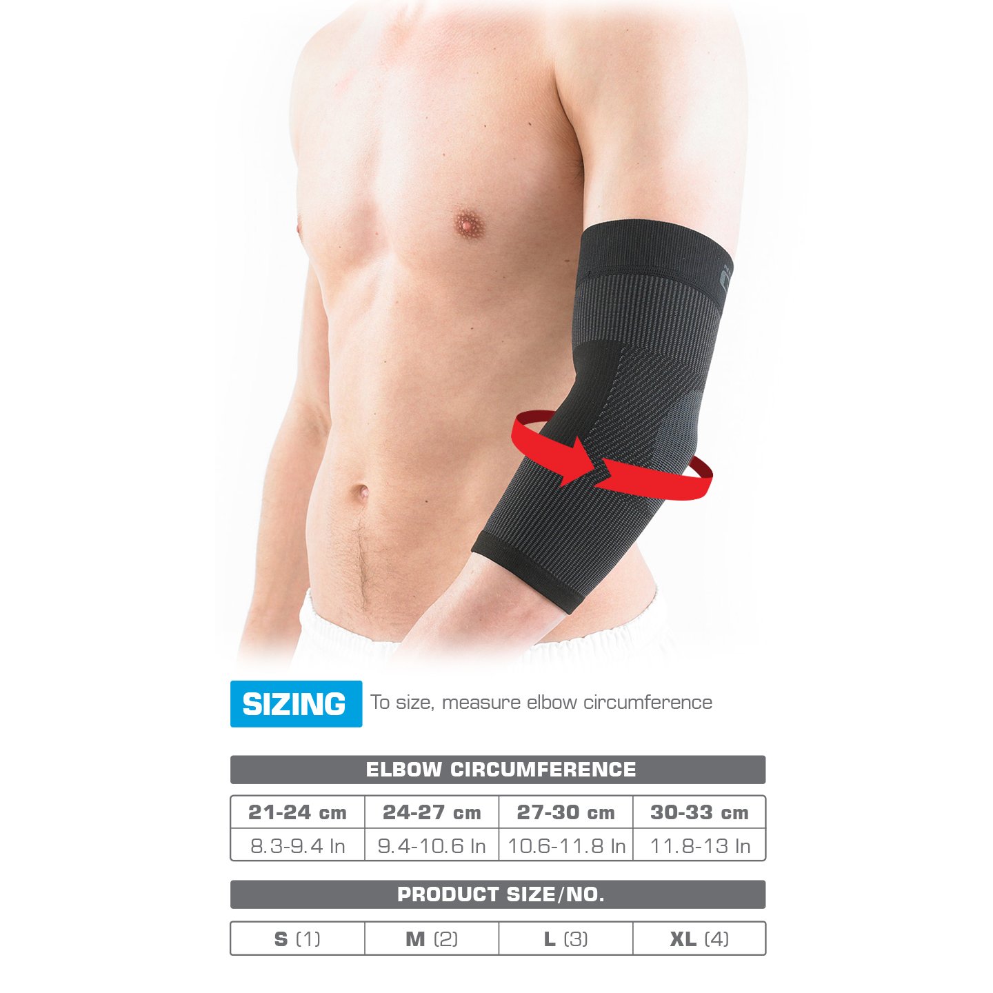 - Fits left or right elbow, available in 4 unisex sizes for best fit (S, M, L, XL), see sizing guide.