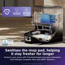 Heated mop-sanitising ThermaCharged NeverTouch Pro Base Automatically washes & sanitises the mop pad with 85 Degree Celsius water and dries with 80 Degree Celsius air. Shark RV3000XEUK / RV3000XEEU is TUV Rheinland certified for Bacteria Elimination.