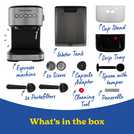 - Box Contents: Espresso Machine Portafilter Portafilter for Pods 2 shot sieve 1 shot sieve Measure/tamper Cleaning tool.